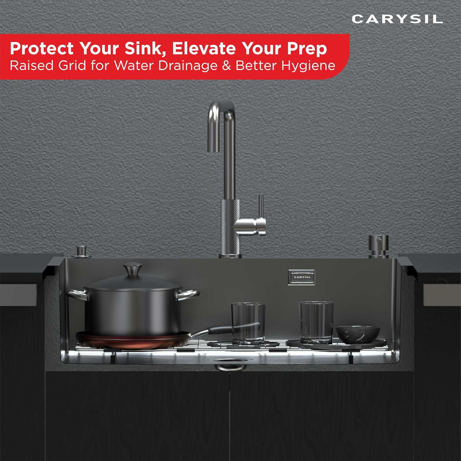 ππ‘πŽπ“π„π‚π“πˆπ•π„ 𝐒𝐔𝐑𝐅𝐀𝐂𝐄: The wire grid from Carysil elevates dishes off the sink bottom, reducing the risk of chips or breaks if items are accidentally dropped. It helps keep your kitchenware safe from damage