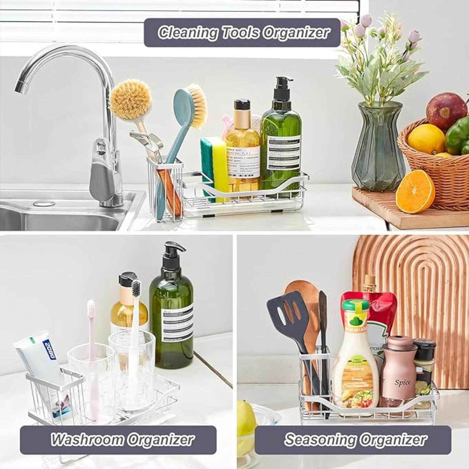 Detachable Brush Holder & Sponge Holder – The space partition allows you to have a separate storage space, you can use it as a whole sink caddy on the counter, you can also separate the brush holder and sink sponge holder on the sink window or next to the faucet, it allows you to place different kitchen cleaning supplies in different areas and your countertops will never be cluttered.