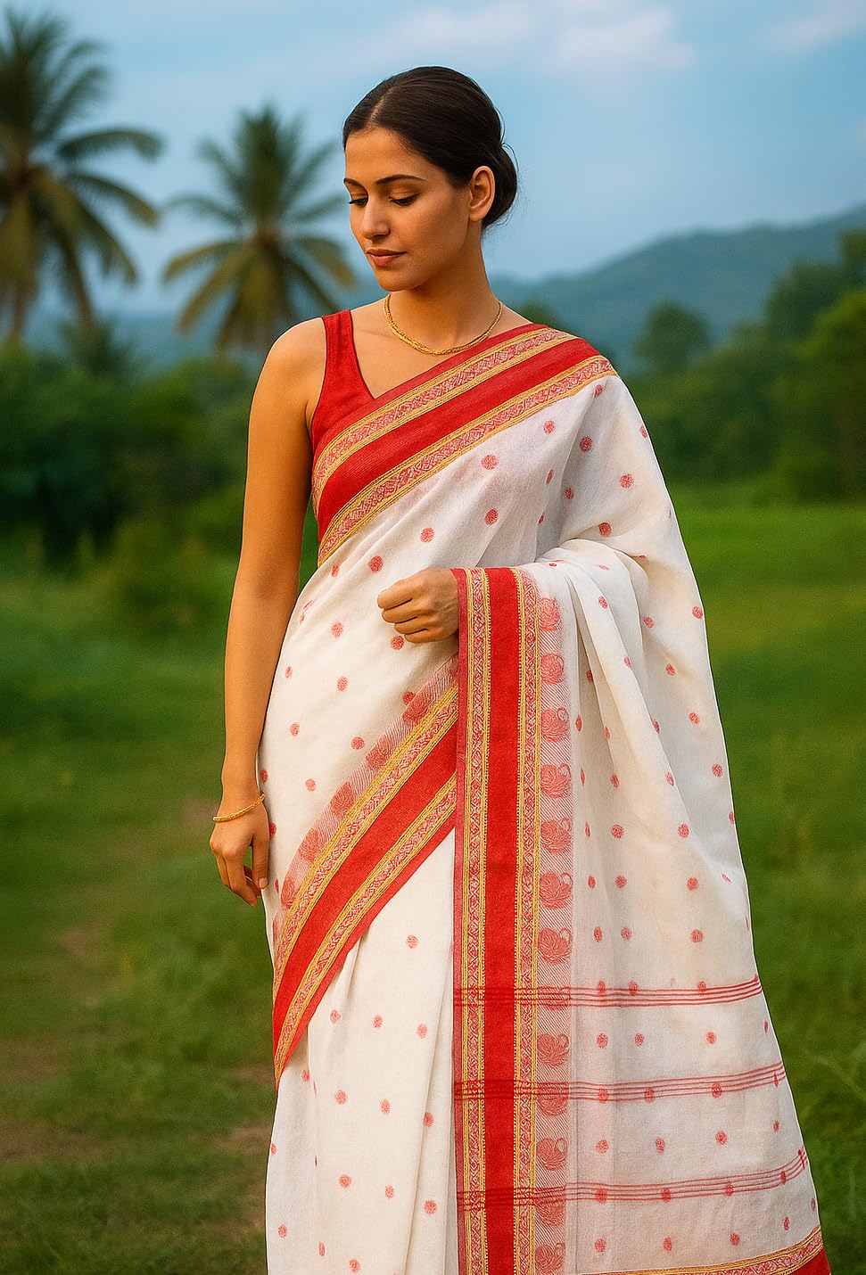 Elegant Bengal tant-soft saree with breathable handloom feel, classic red woven border and delicate dot motifs — perfect for festivals, puja and everyday grace with blouse piece. Discover the understated charm of our Bengal Tant-Soft saree — where classic weave and everyday comfort meet. Inspired by traditional Tant techniques, this saree is crafted for a soft, airy feel that drapes with effortless grace. The cream body is adorned with small, tasteful dot motifs across the fabric, while the vibrant self-weaving red border frames the saree with a refined, traditional finish. Perfect for festive rituals, puja gatherings or simple daytime elegance, the lightweight weave ensures comfort through long hours while maintaining a graceful silhouette. The saree’s natural fall makes pleating and styling easy; it photographs beautifully and carries the quiet sophistication of handloom heritage. We recommend pairing it with a red or contrast blouse, floral hair accessories (gajra) and classic jhumkas for an authentic Bengali look. For preservation, opt for gentle hand wash in cold water or professional dry cleaning; avoid heavy rubbing on motifs and store folded in a breathable cotton bag. Each saree is made with care — slight variations may occur and are part of the charm of handwoven textiles, making every piece uniquely yours. Add this Bengal Tant-Soft saree to your wardrobe for a timeless blend of comfort, culture, and everyday elegance. Discover the timeless elegance of this West Bengal Tant handloom saree, a masterpiece of traditional craftsmanship. The cream-coloured base is adorned with delicate polka motifs, creating a subtle yet striking pattern across the fabric. The saree features a stunning red border with intricate traditional weave work, complemented by golden zari details that add a touch of grandeur. The lightweight Tant cotton fabric ensures comfortable wear throughout the day, making it perfect for both festive occasions and formal events. The contrasting red blouse piece beautifully complements the border, completing the ensemble with grace. The saree’s pallu showcases elaborate striped patterns and traditional motifs, demonstrating the exceptional skill of Bengal’s handloom artisans. This versatile piece combines classical design elements with contemporary aesthetics, making it a must-have addition to your ethnic wardrobe. The saree exemplifies the renowned textile heritage of West Bengal while offering modern-day comfort and style.
