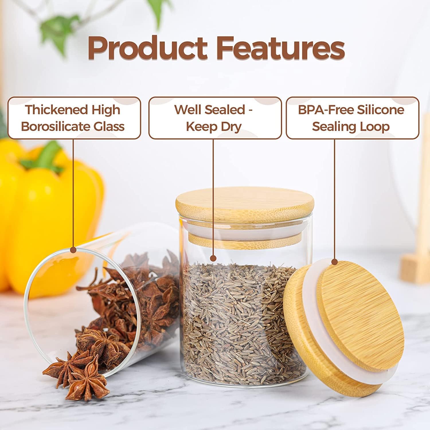 AIR-TIGHT BAMBOO LID:Each jar is equipped with a natural bamboo lid, which provides an airtight seal to keep your spices, salt, sugar, and coffee beans fresh and free from contaminants. The airtight feature ensures that your seasonings are protected from moisture and air, maintaining their flavor and aroma for longer. Bamboo is an eco-friendly material, making these lids a sustainable option for your kitchen.