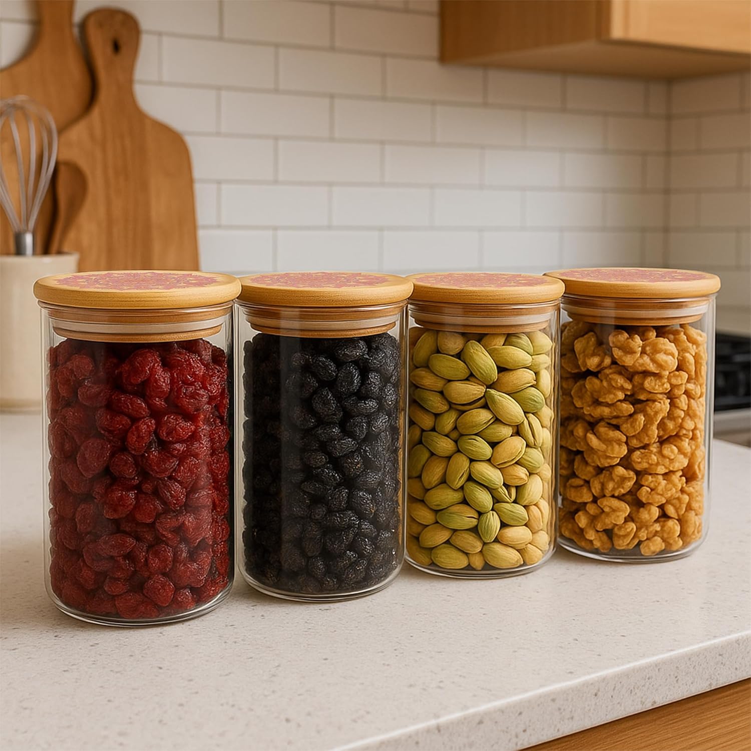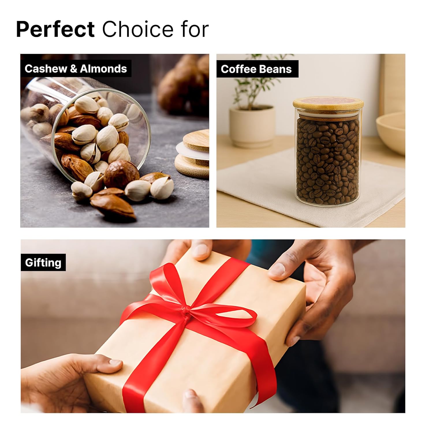 PREMIUM QUALITY GLASS: Made with premium quality borosilicate glass, the Better Home jars are durable and long-lasting. Each jar has a capacity of 600ml (Pack of 4) and comes with a printed bamboo lid for airtight sealing. Included components are borosilicate jar with printed bamboo lid.