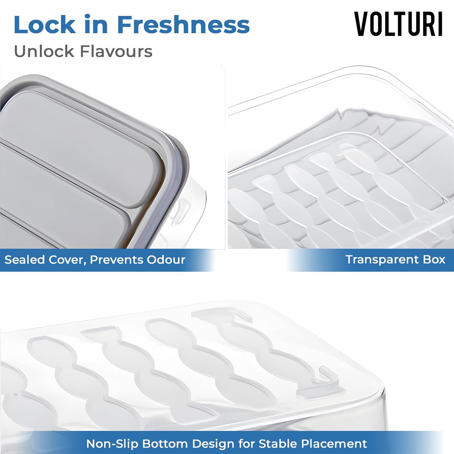 Stylish & Functional: Designed with smooth edges and a clear, elegant look, VOLTURI containers add a touch of style to any modular kitchen. Easy to locate stored food at a glance.